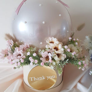 Medium hat box with personalised custom stuffed latex/Bobo balloon inside a hat box arrangement of premium artificial flowers with acrylic disc